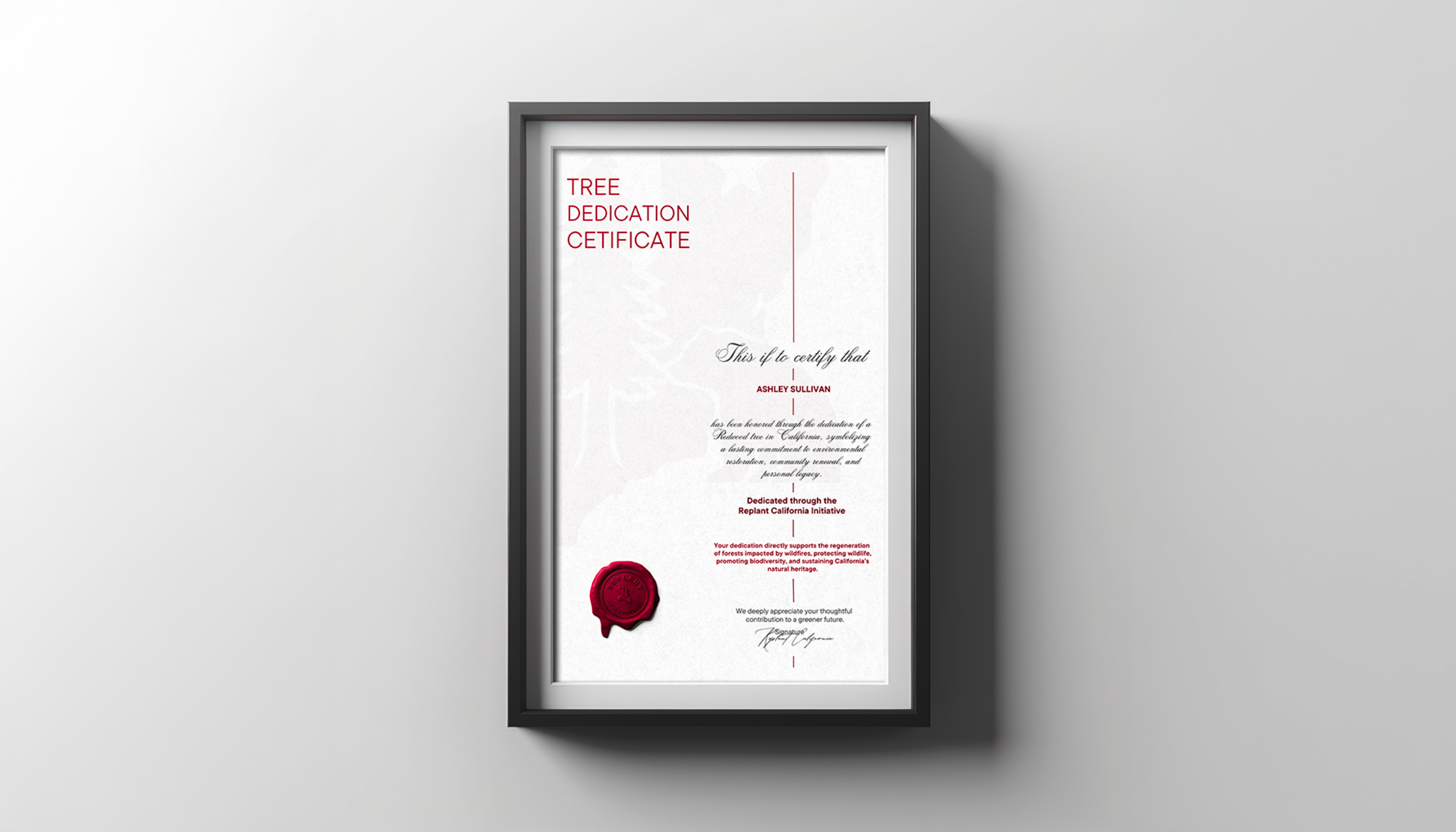 Your tree will be planted in carefully selected California forest areas severely impacted by recent wildfires, prioritizing former wildlife habitats and zones with maximum restoration impact.